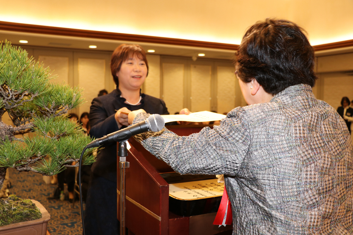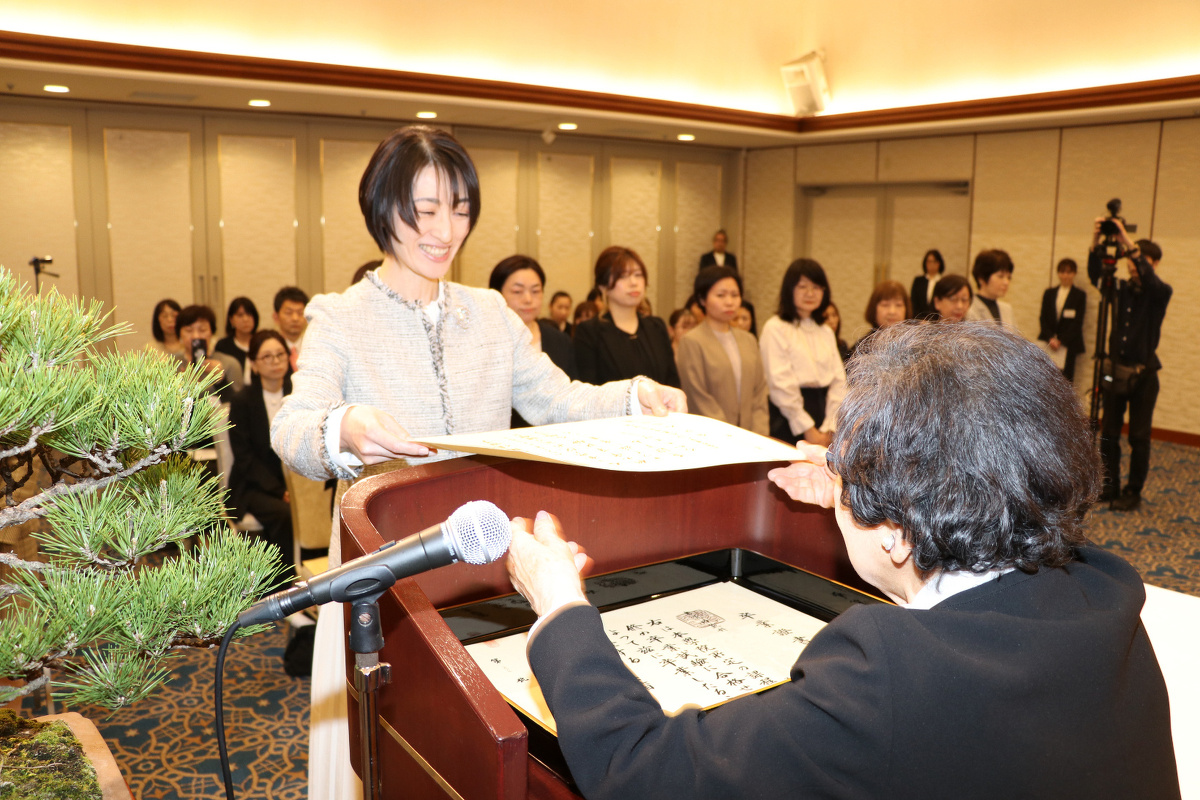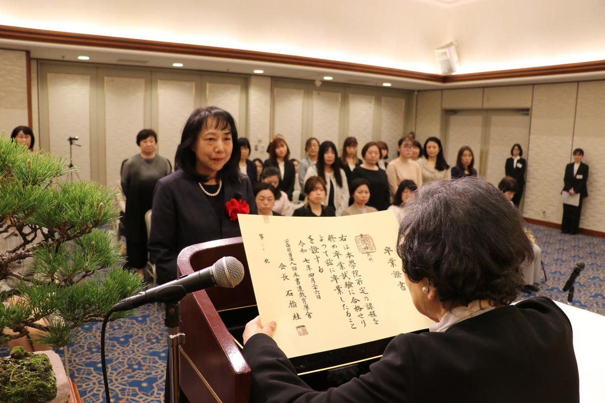 はじめに卒業証書授与が行われました。書道、ペンのⅠ期、Ⅱ期、Ⅲ期と修了期ごとに全員の名前が読み上げられ、各期の代表者に卒業証書を授与されました。続けて、師範試験合格の証しである免許状・標札が、代表者に授与されました。