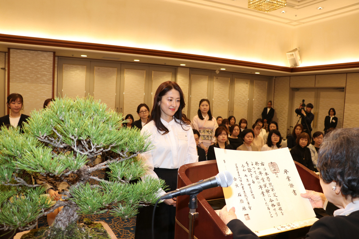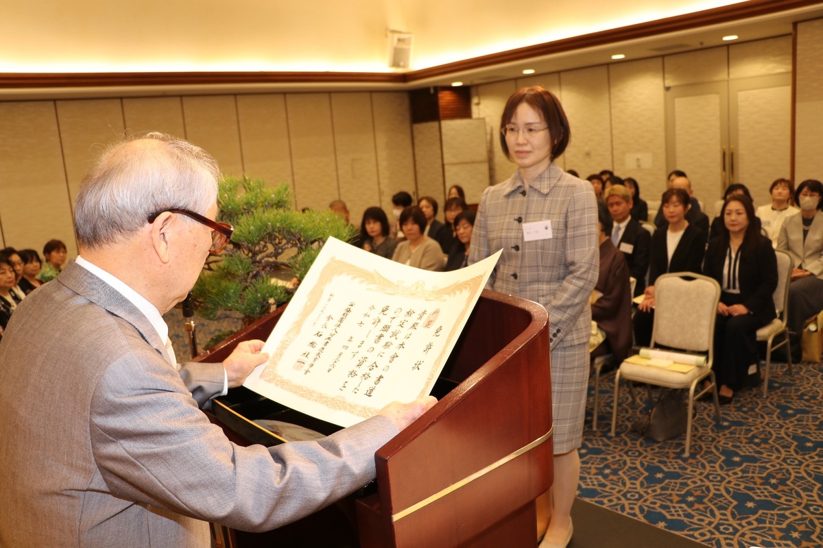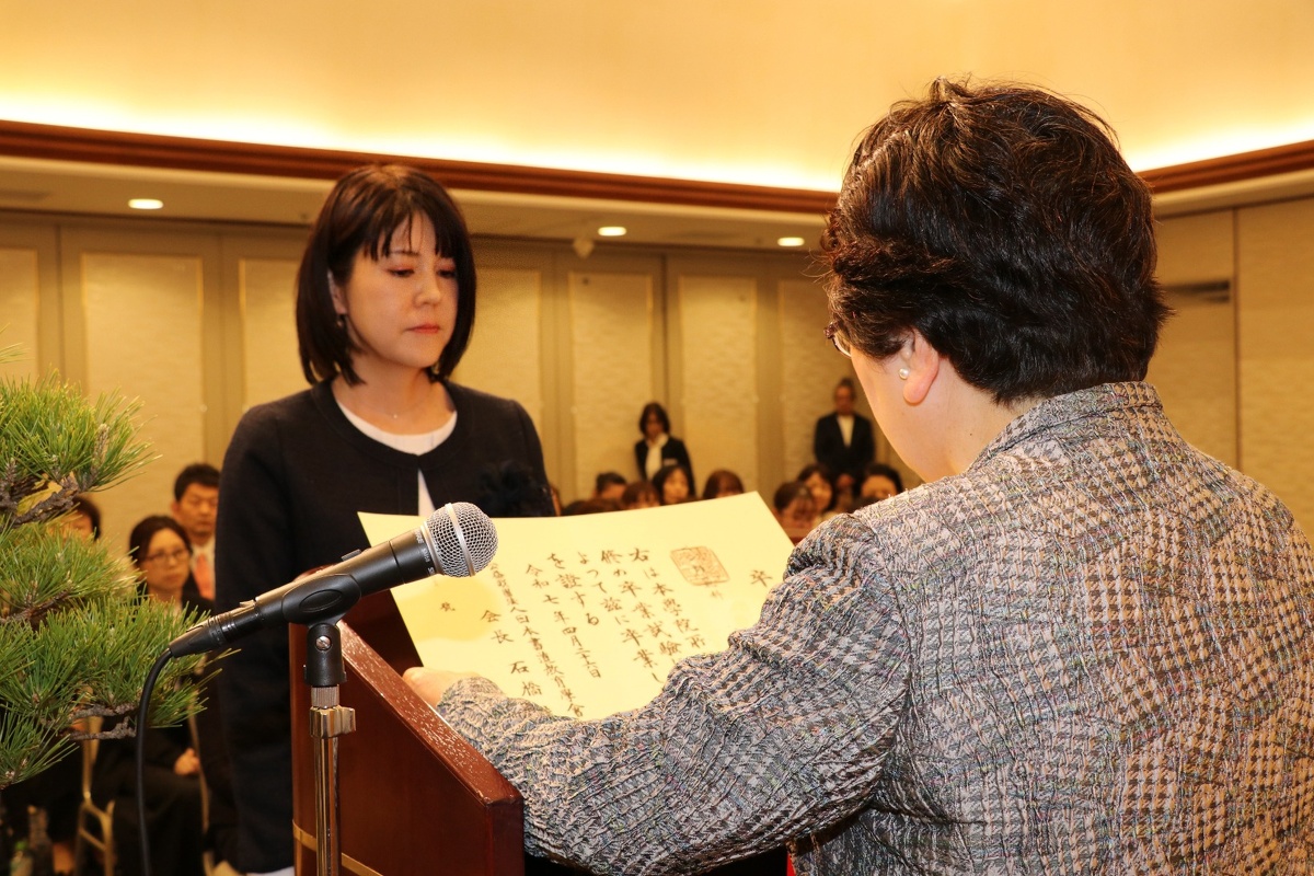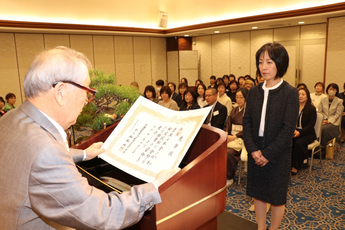 はじめに卒業証書授与が行われました。書道、ペンのⅠ期、Ⅱ期、Ⅲ期と修了期ごとに全員の名前が読み上げられ、各期の代表者に卒業証書を授与されました。続けて、師範試験合格の証しである免許状・標札が、代表者に授与されました。