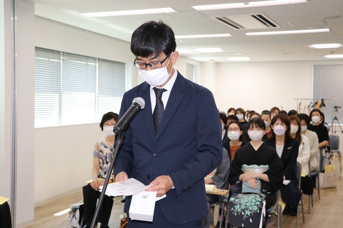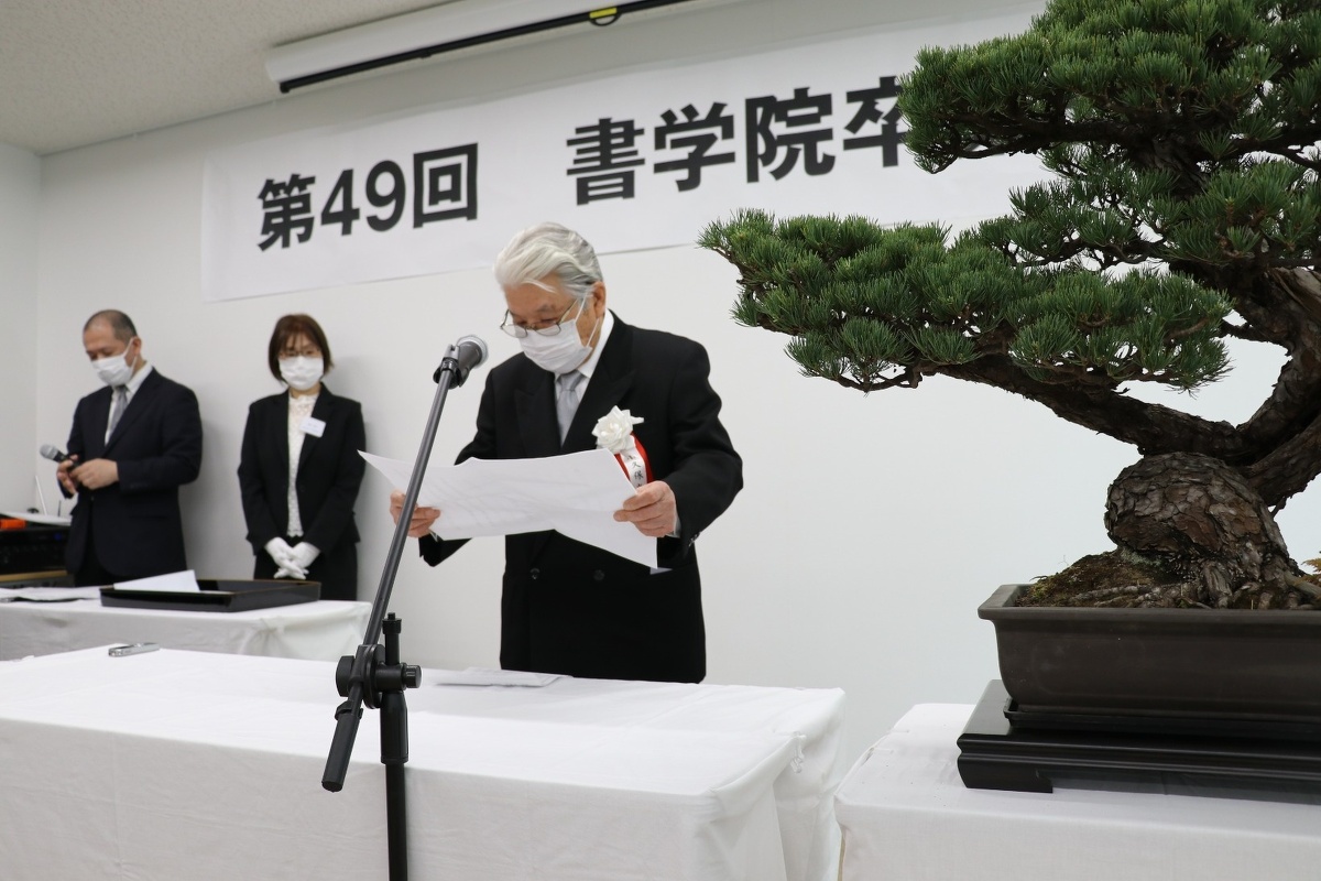 小久保嶺石先生による式辞では、コロナ禍もあり、2年以上をかけた今年の卒業生に対し、その苦労を労いつつ、「石橋犀水先生は 学書者にこれからもおごることなくたゆまずに続けよと「拙を守れ」という忠告と励ましの言葉を残されています この言葉を胸に卒業後も特設科、不二誌、展覧会等で更に腕を磨いていただきたいと思います」と激励の言葉を贈られました。