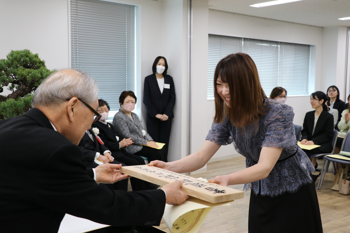卒業書作展の優秀者表彰では、髙石ゆりあさん、西田有希子さん、槻木新二さん、地引友美さんに書学院院長賞が授与されました。