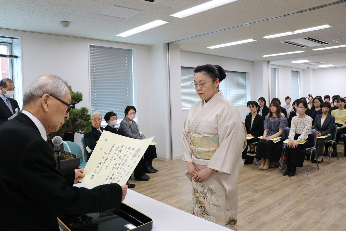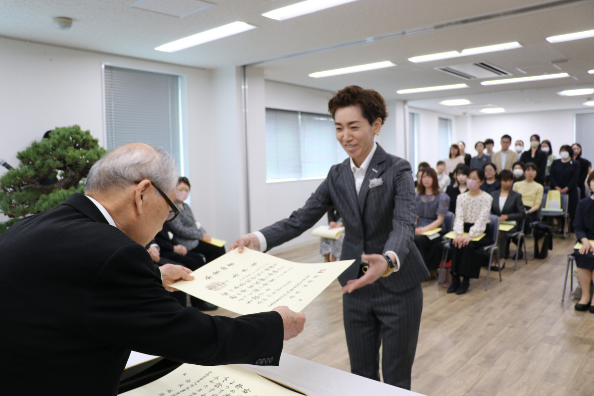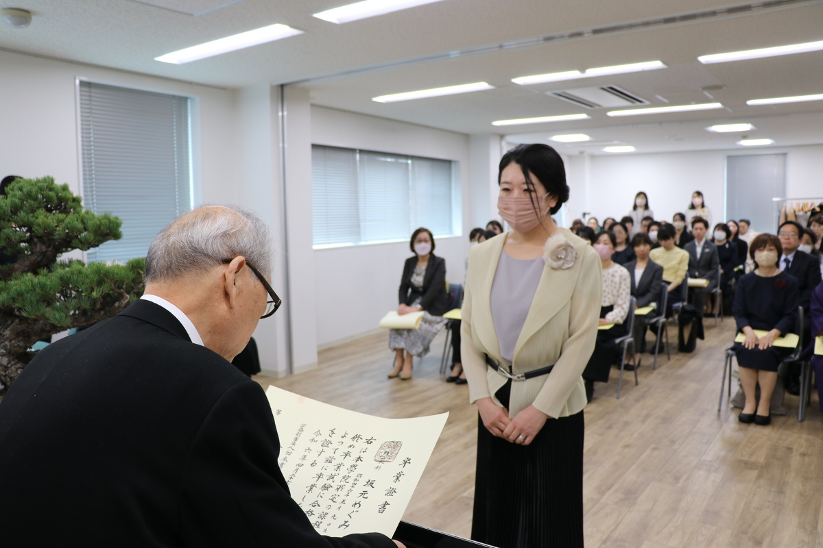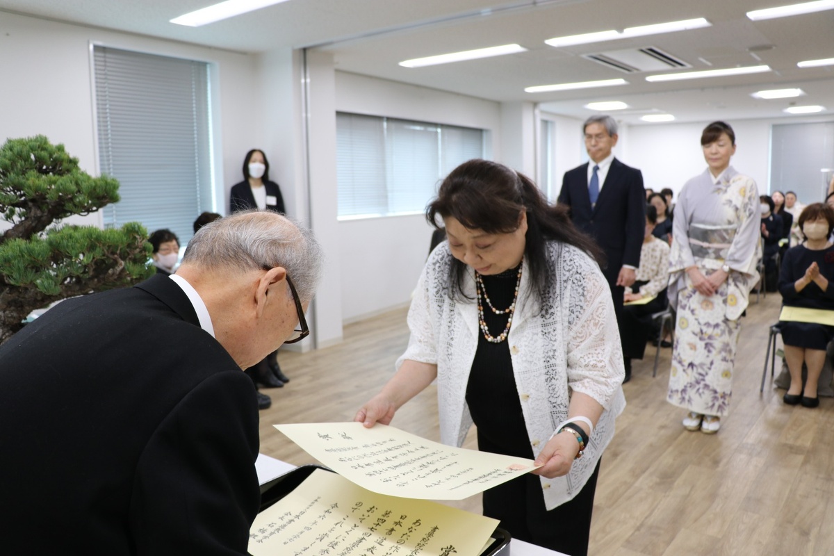 はじめに卒業証書授与が行われました。石橋鯉城書学院院長が授与者として登壇。書道、ペン、篆刻のⅠ期、Ⅱ期、Ⅲ期と修了期ごとに全員の名前が読み上げられ、各期の代表者に卒業証書を授与されました。続けて、師範試験合格の証しである免許状・標札が、合格者を代表して川嶋莉奈さんに授与されました。