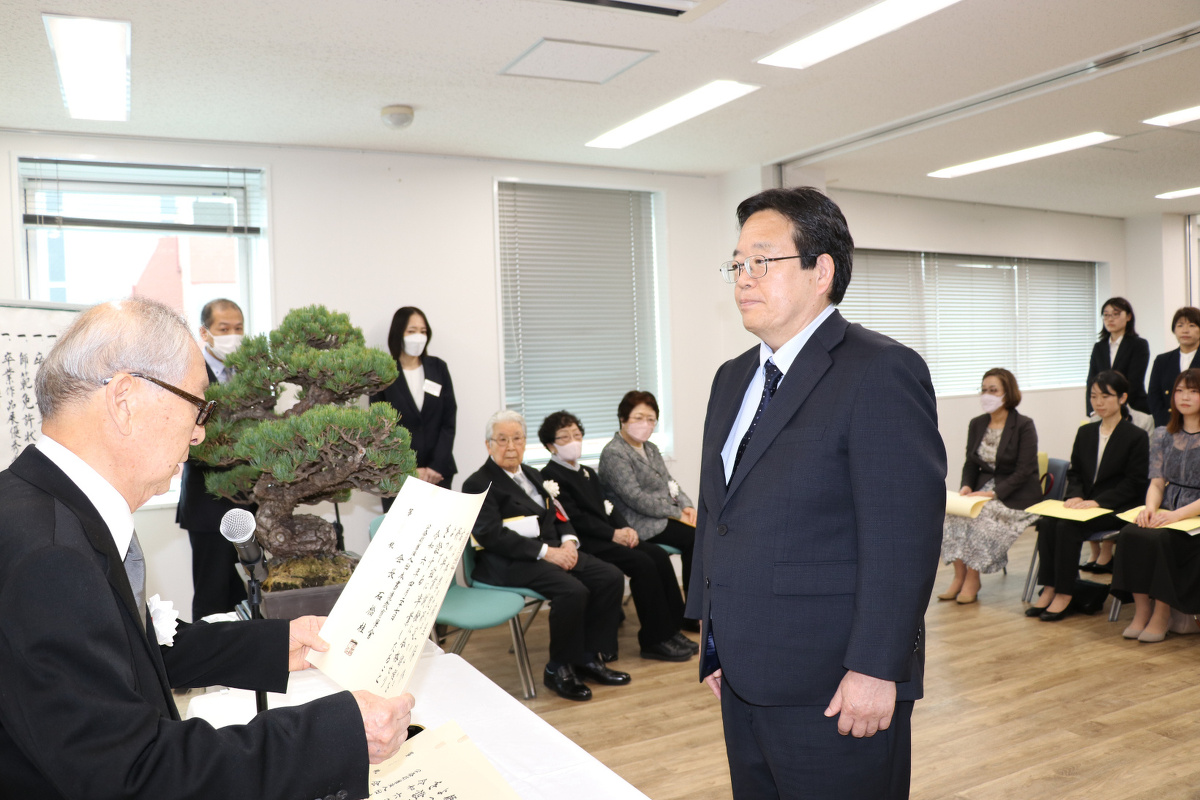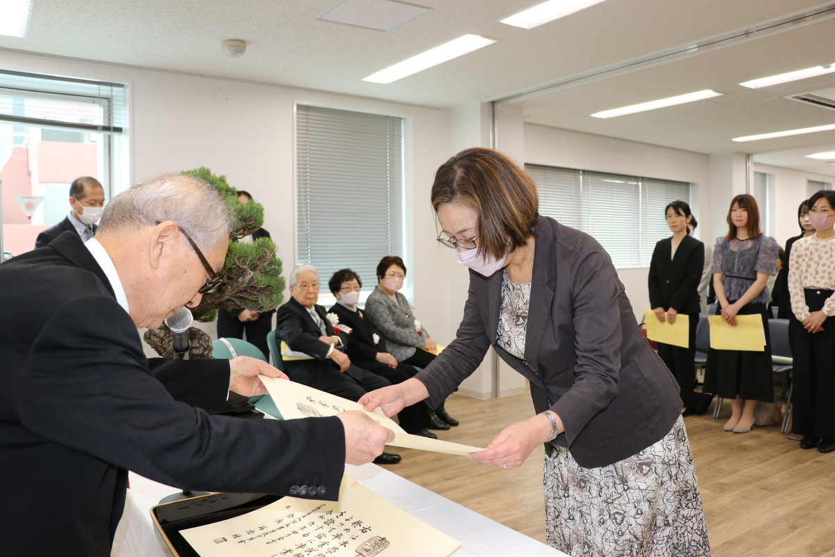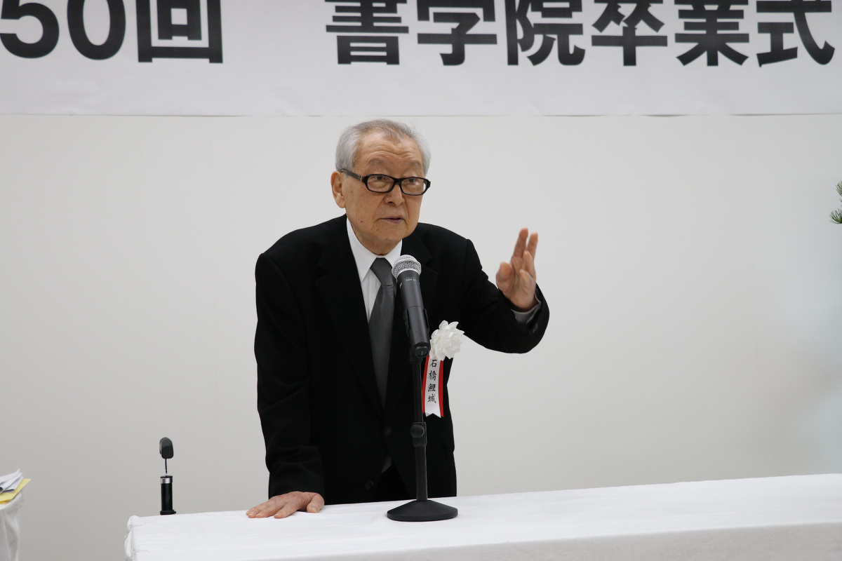 続いて石橋鯉城院長より式辞を賜りました。「卒業おめでとうございます。皆さん自身の努力はもちろんですが、周囲の方々のご理解もあって、今日のこの佳き日を迎えられたことと思います。私は現在、87歳ですが、60歳を過ぎ、二回目の人生に入ってから書道が見えるようになってきました。先人の遺してくれた作品の筆遣い、呼吸を感じられるようになり、作品と会話ができるようになりました。継続は力なり。これから皆さんにもそういう世界が開けてくると思いま宇す。卒業はその第一歩だと思って、ともに進んでいきましょう」と実感のこもった温かい励ましの言葉に、卒業生一同、熱心に聞き入っていました。