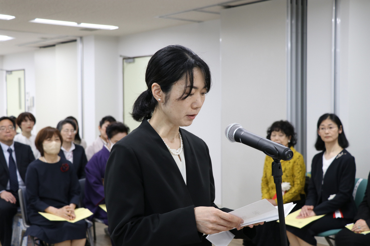卒業生を代表して書道師範科・小畑知子さんが謝辞を述べられました。書学院での学びで得たもの、講師の先生方への感謝、そして今後の精進の意気ごみを、率直な言葉で語ってくれました。