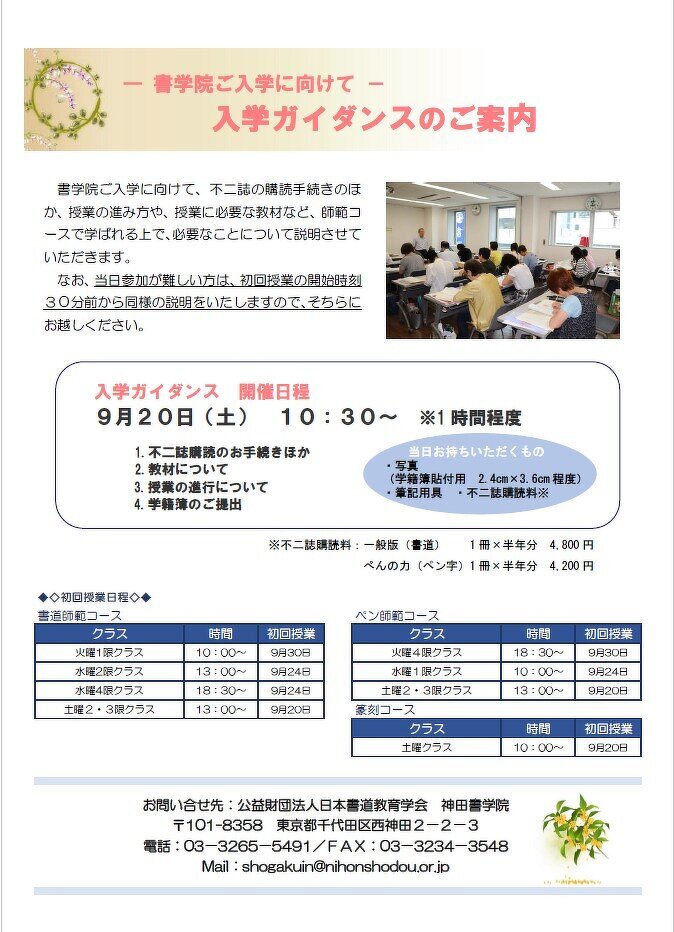 書学院ご入学に向けて、不二誌の購読手続きのほか、